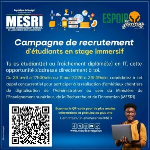 Afin de soutenir cette dynamique, le Ministère de l’Enseignement supérieur, de la Recherche et de l’Innovation (MESRI), via le Centre des Réseaux et des Systèmes d’Information (CRSI), lance un appel à candidatures concurrentiel destiné aux étudiants et diplômés sénégalais.